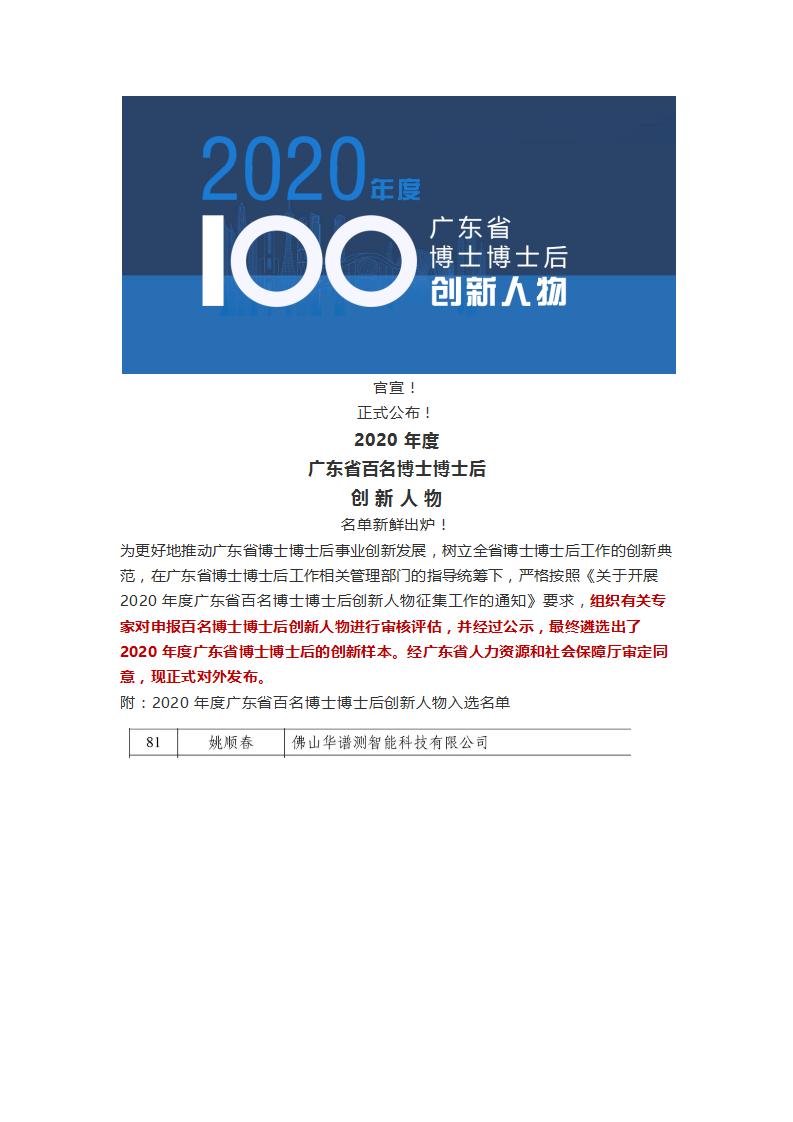 华谱测总经理入选“2020年度广东省百名博士博士后创新人物”近日,广东省博士博士后人才发展促进会公示了《2020年度广东省百名博士博士后创新人物候选人名单》,我司总经理姚顺春上榜。